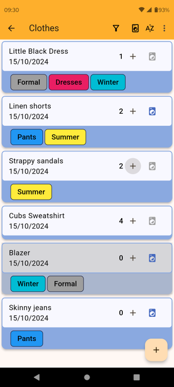 Used Today는 필요에 맞게 사용자 정의 카테고리 를 생성할 수 있게 해줍니다. 예를 들어 옷, 가방 또는 기타 항목을 포함할 수 있습니다. 각 카테고리 내에서 개별 항목을 추가 하고 태그를 할당 할 수 있습니다. 예를 들어 “여름” 또는 “일”과 같은 태그를 사용할 수 있습니다. 사용 기록은 간단합니다: 항목을 사용한 횟수를 추적하려면 더하기 기호를 누르기만 하면 됩니다.